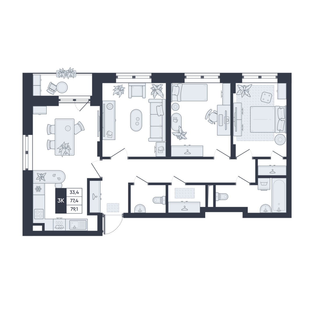 В новом строящемся жилом доме представлен широкий выбор планировок: от компактных студий до комфортабельных и просторных трехкомнатных квартир евроформата.